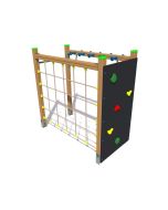Aktivitetsapparat av lakkert tre og vanntett finer med klatrevegg, klatrenett, klatretau, taustige og ringer. Passer for barn fra 3 år. Hele konstruksjonen er sertifisert med EN1176.