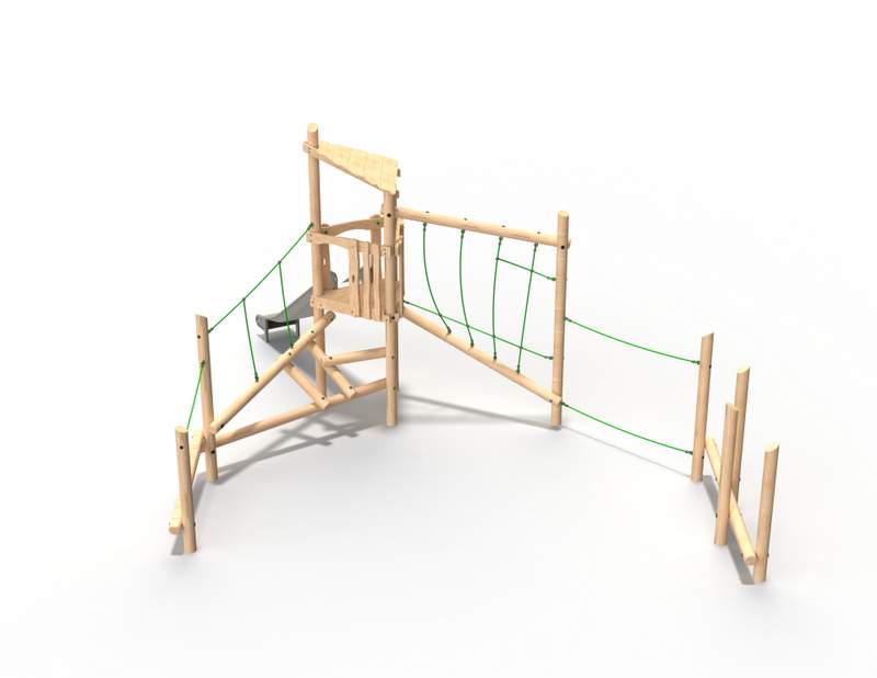 Laget av naturlig tømmer. Hver skjeve design inviterer barn til å klatre, balansere og utforske.