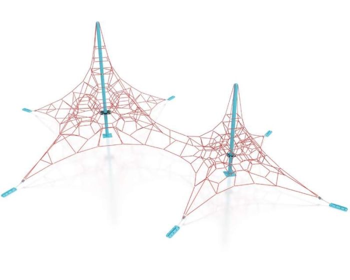Stor dobbel 3D klatrepyramide for barna fra 5 år. Godkjent for offentlig bruk. Klatrenetts farge kan velges ved bestilling. Vedlikeholdsfri.