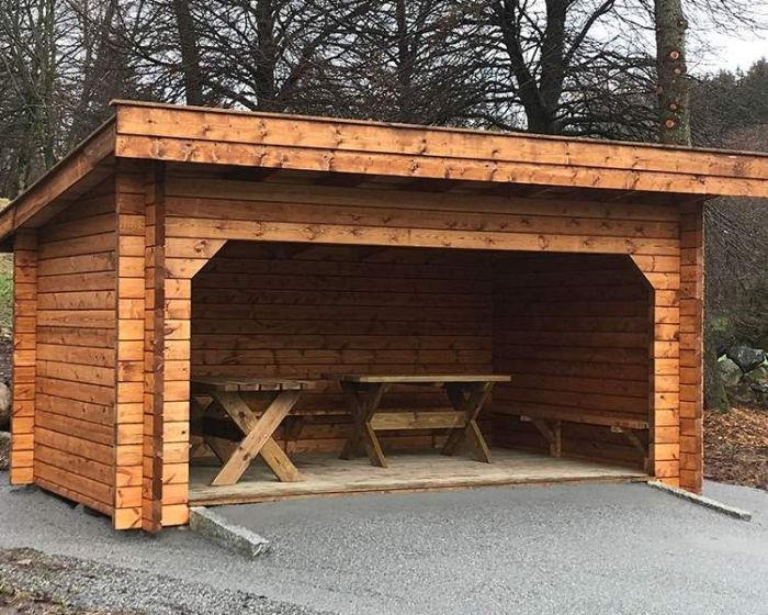 Jomfruland er en solid kvalitetsgapahuk i 70 mm laft (furu), og takkonstruksjonen tåler store snømengder. Denne gapahuken er ideell for barnehager, skoler og velforeninger og har plass til 20-22 barn eller 18-19 voksne på benkene langs veggene. Utvendige mål med lafteknuter er 3 × 5 meter.