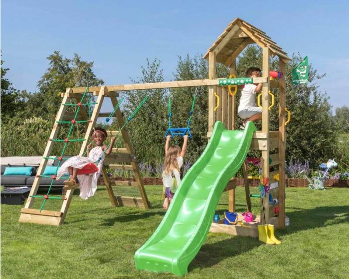 Cocoon lekesett fra den nyeste Jungle Gym Adventure series består av leketårn og huskestativ med to huskeseter og kombinert klatrevegg. Grønn sklie kommer vanlig med, men det er mulig å velge en annen farge (mørkegrønn).
