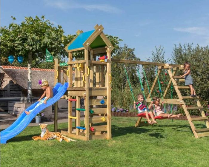 Nomad lekesett fra den nyeste Jungle Gym Adventure series består av leketårn og huskestativ med to huskeseter og kombinert klatrevegg. Grønn sklie kommer vanlig med, men det er mulig å velge en annen farge (mørkegrønn).