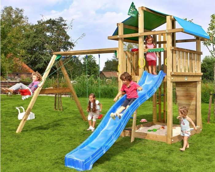 Fargen på sklien som følger med lekestativet kan være en av følgende: blå, lysegrønn, mørkegrønn, gul. Den eneste måten å få den fargen som ønskes på, er å merke det ved bestilling. Du kan også velge rødt eller fuchsia ved bestilling.