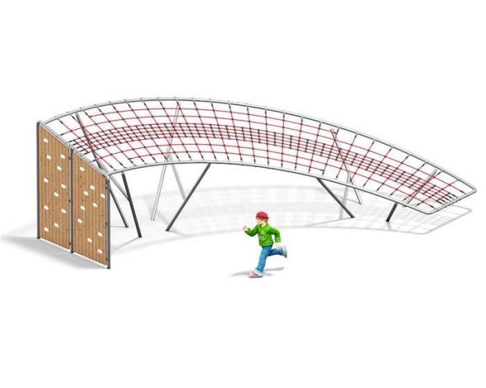 Klatrestativ Komethalen Skole av varmgalvanisert stål eller rustfritt stål. Består av stor klatrenett, klatrevegg og lange sklistenger. Passer bra for skole, EN1176 sertifisert, hærverksikker.