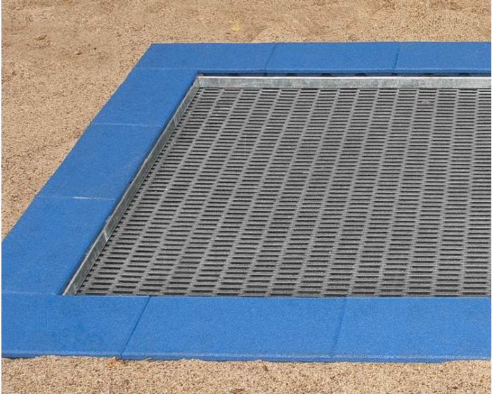 Trampoline for utendørs bruk. Nedgravings trampoline med metallramme som settes i bakken og blå fallmatte. Indre mesh laget av svarte eller grå plastlameller som både er slitesterk og sikker mot hærverk. Passer for skole, barnehage park eller sameie. Beskyttelsesmatte i gummi rundt som sikrer mot skader. metalramme settes i bakken og er lett å montere. Trampoline sertifisert for offentlig bruk med EN1176. Vandalsikre. Vedlikeholdsfri. Åpnes for rengjøring.