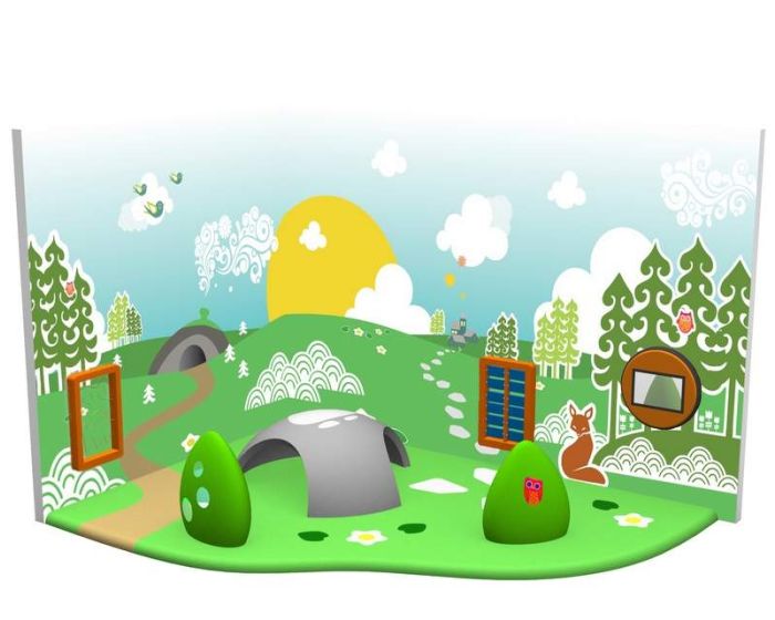 Robust innendørs lekeplass for hjørninstallasjon, med interaktiv skjerm, to lekepanell og tunnel. Skjermen inneholder flere spill med forskjellige vanskelighetsnivåer for ulike aldre. Kan med fordel plasseres i mindre bedrifter hvor barna trenger litt form for aktivitet, mens foreldrene kan fredelig gjøre sine kjøp eller ta viktige beslutninger. Veggbilde kommer med.