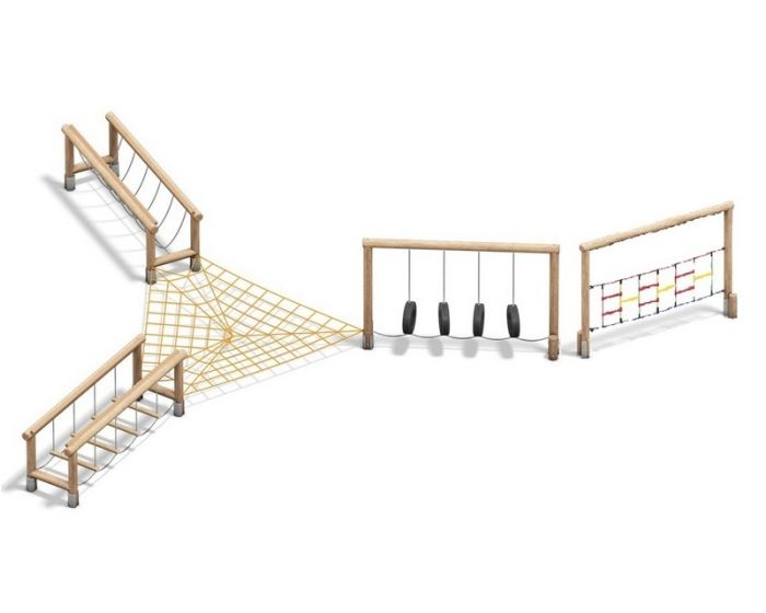 Klatrenett. Dekk hinderløype. Trekant nett som kobler flere hinderløype-elementer til en. Bjelkebro. Kjetting-bro. Kan være kombinert med andre balanseutstyr. Passer for barn på flere alderstrinn fra 4 år. Hele konstruksjonen er sertifisert med EN1176. Vandalsikre.