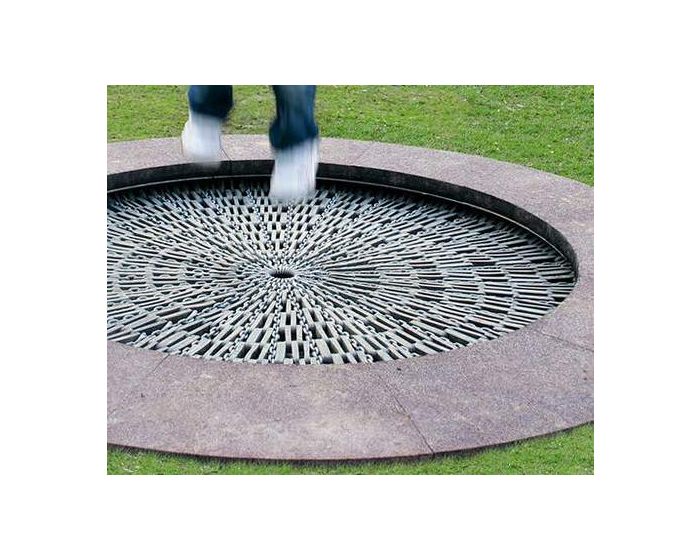 Solid trampoline med hoppeflate Ø1,90 m for utendørs bruk. Nedgravings trampoline med metallramme som settes i bakken og svart fallmatte indre mesh laget av plastlameller som både er slitesterk og sikker mot hærverk. Passer for skole, barnehage park eller borettslag. Beskyttelsesmatte i gummi rundt som sikrer mot skader. metalramme settes i bakken og er lett å montere. Trampoline sertifisert for offentlig bruk med EN1176. Vandalsikre. Vedlikeholdsfri. Ramme kan tas ut for rengjøring.